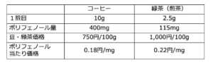 コーヒーも緑茶も抗酸化作用がある。前者がクロロゲン酸(の分解物)、後者はカテキン(これも分解物)が効果をたらしめている。そこでポリフェノールの量を比較した。