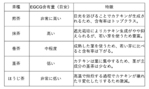 ちなみに茶葉の種類とEGCG(エピガロカテキンガレート)の含有量を参考まで調べた。思うに山は植林で杉が多く、一方で緑茶よりコーヒーの機会が多くなったニッポン。 タイトルは抹茶となっています。EGCGは煎茶が高い。これについて抹茶は粉ごと全部のむのに対して煎茶は抽出方式なので1煎目では7割程度。味はともあれ何回も抽出する必要がある。