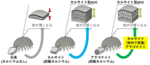 ダンゴムシに炭酸カルシウムを含まない(例:石英)と含む鉱物を舐めさせたところ、炭酸カルシウムを含む鉱物を舐めたダンゴムシの背は厚く固く、そうでない石英では薄い結果を見出した。ここで疑問に思ったのは甲殻類が成長する時に脱皮をするが、脱皮時に殻が硬いと脱皮できるのだろうか?と。それを思いつつ文献を読み進む。その結果、炭酸カルシウム含有鉱物を舐める→外骨格殻を硬くするメカニズムの中間体として非晶性炭酸カルシウムとして貯蔵しておいて、キチンやタンパク質で構成される型の中に充填して結晶化させるとある。非晶性炭酸カルシウムは柔軟・水溶性だから型への移動が容易。この逆に脱皮する時は骨格にある結晶性炭酸カルシウムの何割を非晶性炭酸カルシウムがいわば潤滑剤として利用してスムーズに新しい骨格へ引き継ぐ仕組み。実にすごいメカニズムなのだ。材料として金属、樹脂にも応用できると考えられる。