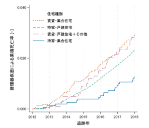 「38,731人分の6年間の大規模な追跡調査データと厚生労働省の死因データを突合し、住宅種別を4種類(持家・戸建住宅/持家・集合住宅/賃貸・戸建住宅/賃貸・集合住宅)に分類して循環器疾患による死亡を比較した結果、所得等を調整した上でも、持家・集合住宅と比べて賃貸・集合住宅の居住者の死亡リスクが高いことが明らかになりました。」