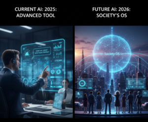 - 右側(2026年以降:社会のOS) AIが画面を飛び出し、自律的なエージェントとして街やプロジェクトを動かしている姿。フィジカルAI(ロボット)との融合や、人間が「AIを束ねる指揮官」として活動する未来像を表現。