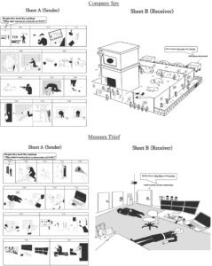2つのスパイ漫画を片方は英語で説明し、受け手は聞いた通りに漫画絵を描く。その時に双方の頭にfNIRS(エフニルス/機能的近赤外分光法)装置を取り付け、脳のどの部分が活性化しているのかも同時に調べたもの。